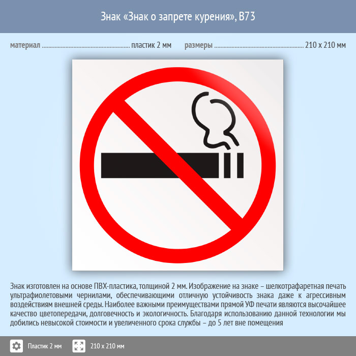 Знак «Знак о запрете курения», B73 (пластик, 210х210 мм) в Магнитогорске купить