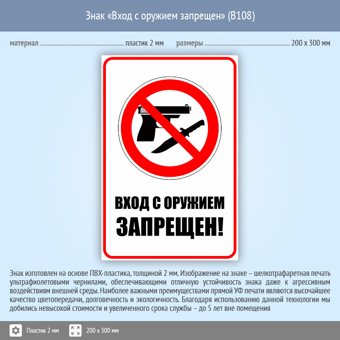 Знак «Вход с оружием запрещен», B108 (пластик, 200х300 мм) в Магнитогорске купить