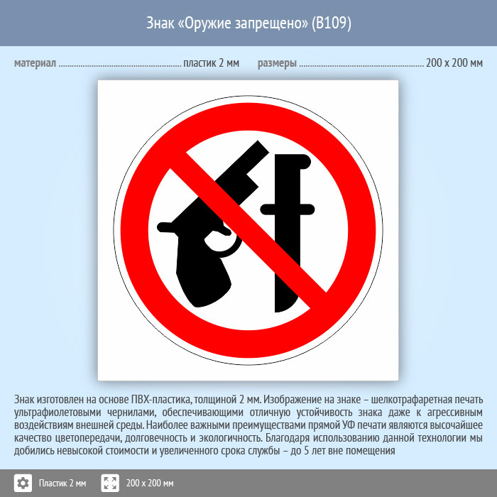 Знак «Оружие запрещено», B109 (пластик, 200х200 мм) в Магнитогорске купить