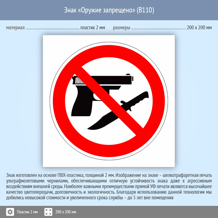 Знак «Оружие запрещено», B110 (пластик, 200х200 мм) в Магнитогорске купить
