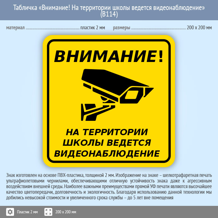 Табличка «Внимание! На территории школы ведется видеонаблюдение», B114 (пластик, 200х200 мм) в Магнитогорске купить
