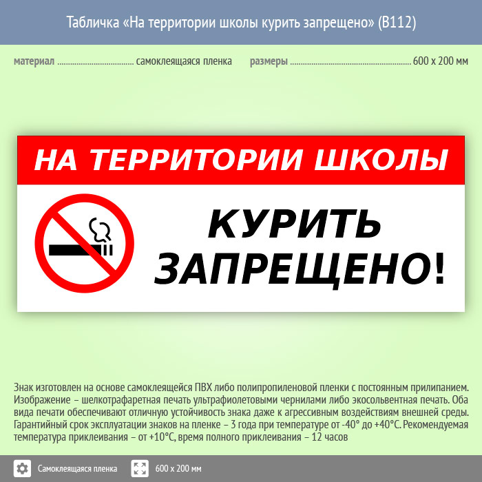 Табличка «На территории школы курить запрещено», B112 (пленка, 600х200 мм) в Магнитогорске купить