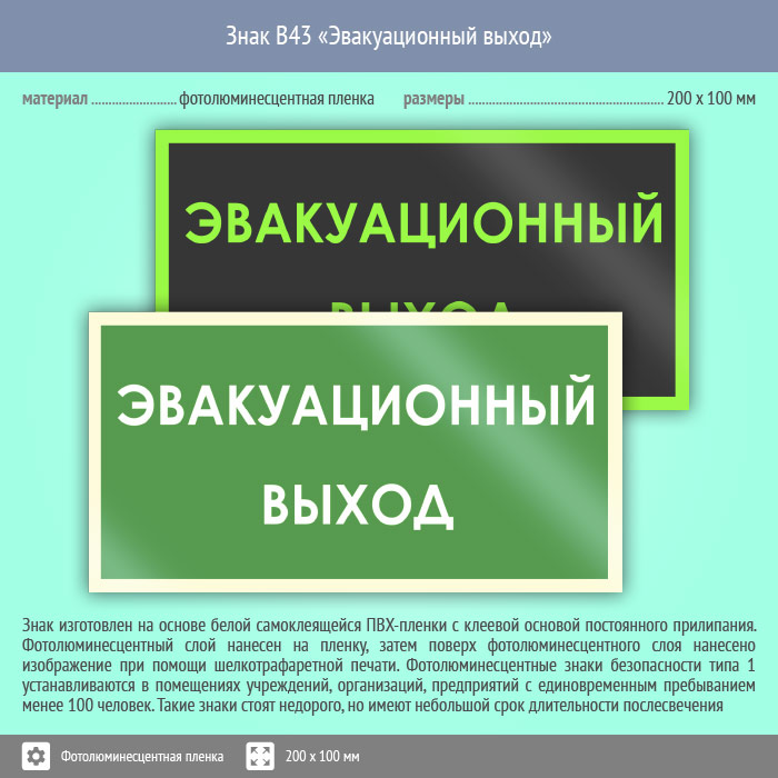 Знак B43 «Эвакуационный выход» (фотолюминесцентная пленка ГОСТ 34428-2018, 200х100 мм) в Магнитогорске купить