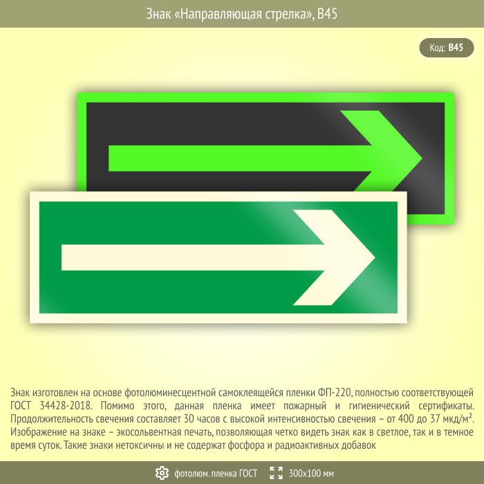Знак «Направляющая стрелка», B45 (фотолюминесцентная пленка ГОСТ 34428-2018, 300х100 мм) в Магнитогорске купить