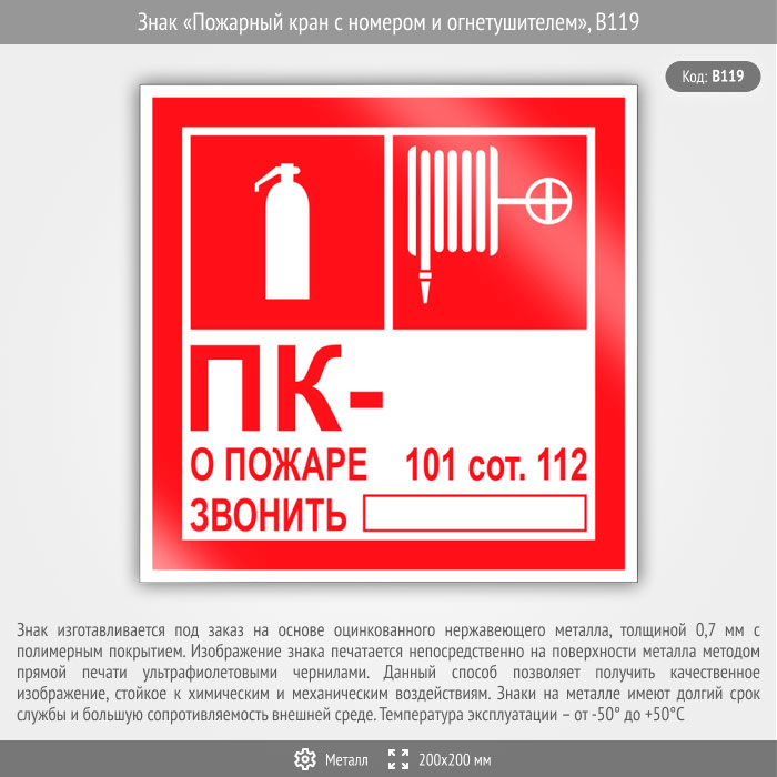 Знак «Пожарный кран с номером и огнетушителем», B119 (металл, 200х200 мм) в Магнитогорске купить