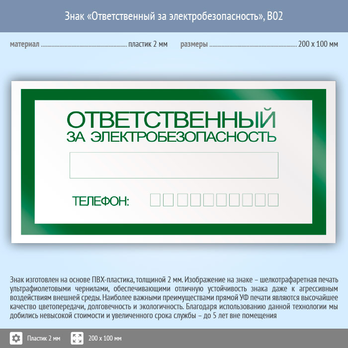 Знак «Ответственный за электробезопасность», B02 (пластик, 200х100 мм) в Магнитогорске купить