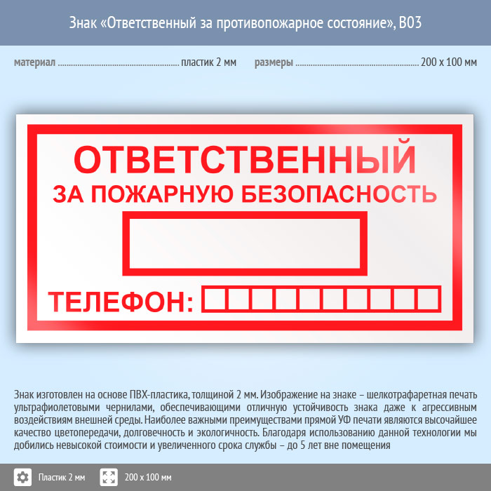 Знак «Ответственный за пожарную безопасность», B03 (пластик, 200х100 мм) в Магнитогорске купить