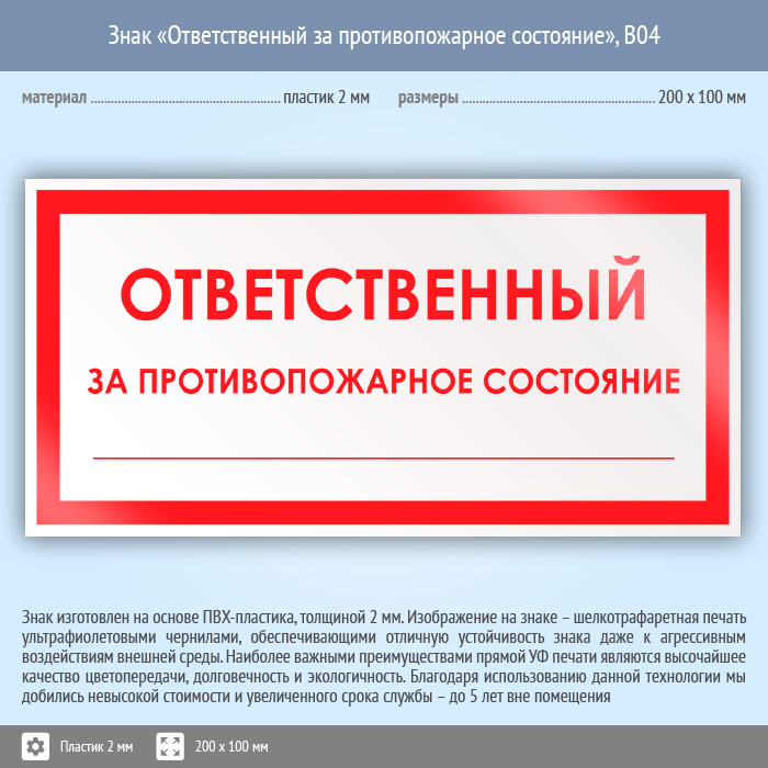 Знак «Ответственный за противопожарное состояние», B04 (пластик, 200х100 мм) в Магнитогорске купить