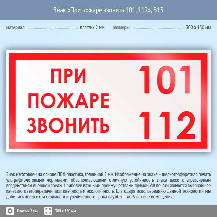 Знак «При пожаре звонить 101, 112», B13 (пластик, 300х150 мм) в Магнитогорске купить