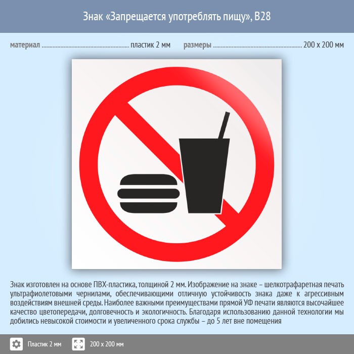 Знак «Запрещается употреблять пищу», B28 (пластик, 200х200 мм) в Магнитогорске купить
