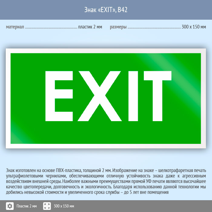 Знак «EXIT», B42 (пластик, 300х150 мм) в Магнитогорске купить