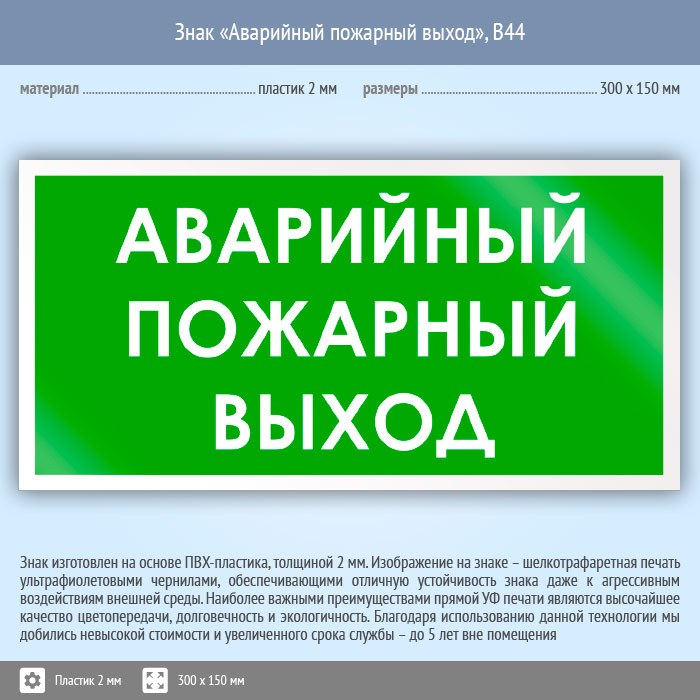 Знак «Аварийный пожарный выход», B44 (пластик, 300х150 мм) в Магнитогорске купить