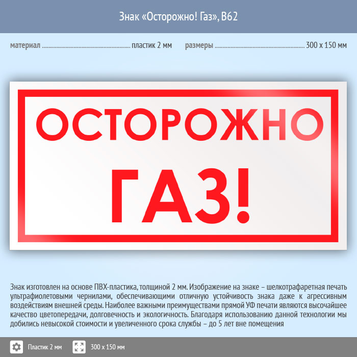 Знак «Осторожно! Газ», B62 (пластик, 300х150 мм) в Магнитогорске купить