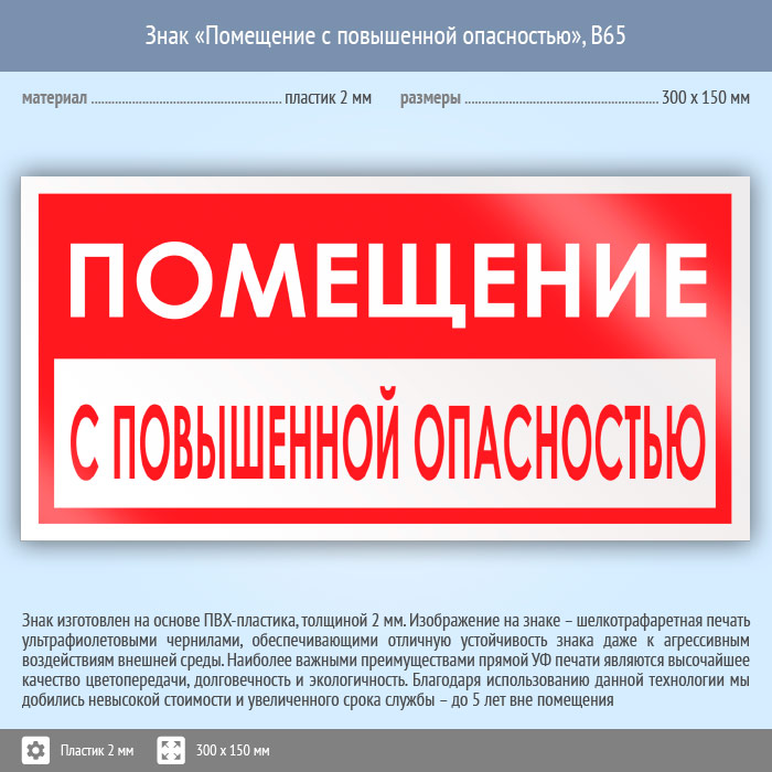 Знак «Помещение с повышенной опасностью», B65 (пластик, 300х150 мм) в Магнитогорске купить