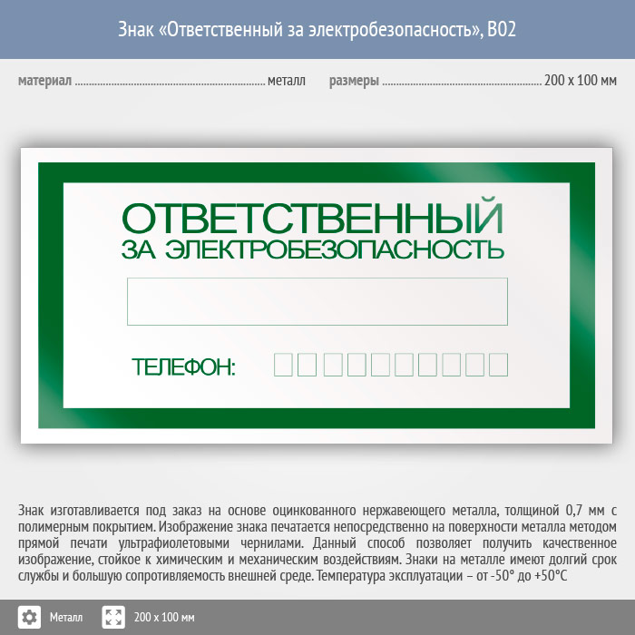 Знак «Ответственный за электробезопасность», B02 (металл, 200х100 мм) в Магнитогорске купить