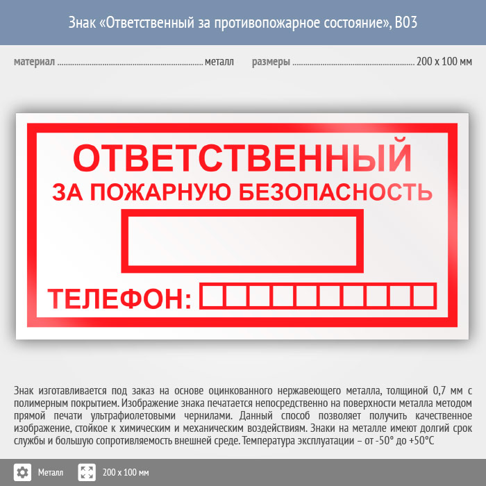 Знак «Ответственный за пожарную безопасность», B03 (металл, 200х100 мм) в Магнитогорске купить