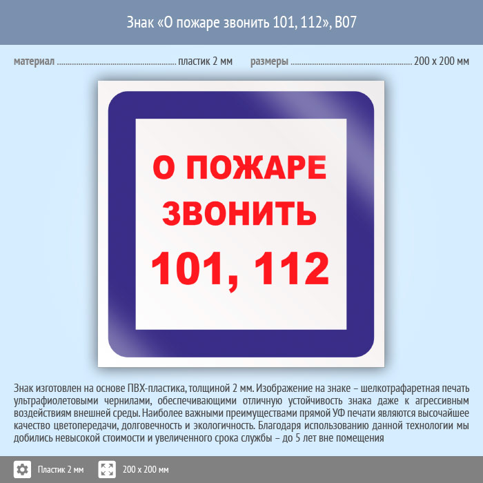 Знак «О пожаре звонить 101, 112», B07 (пластик, 200х200 мм) в Магнитогорске купить