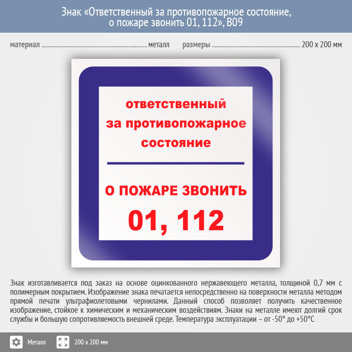 Знак «Ответственный за противопожарное состояние, о пожаре звонить 01, 112», B09 (металл, 200х200 мм) в Магнитогорске купить