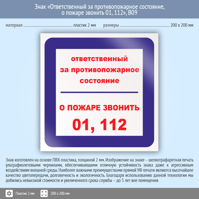 Знак «Ответственный за противопожарное состояние, о пожаре звонить 01, 112», B09 (пластик, 200х200 мм) в Магнитогорске купить