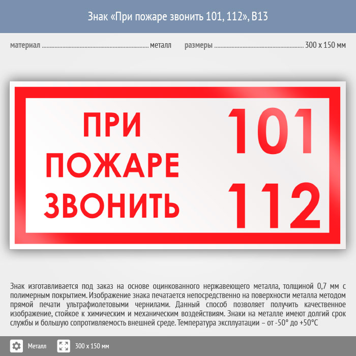 Знак «При пожаре звонить 101, 112», B13 (металл, 300х150 мм) в Магнитогорске купить