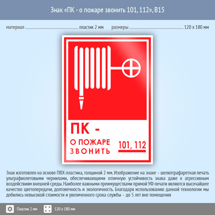 Знак «ПК - о пожаре звонить 101, 112», B15 (пластик, 120х180 мм) в Магнитогорске купить