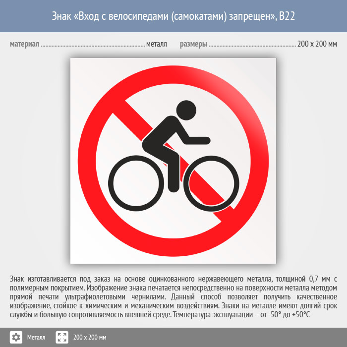 Знак «Вход с велосипедами (самокатами) запрещен», B22 (металл, 200х200 мм) в Магнитогорске купить