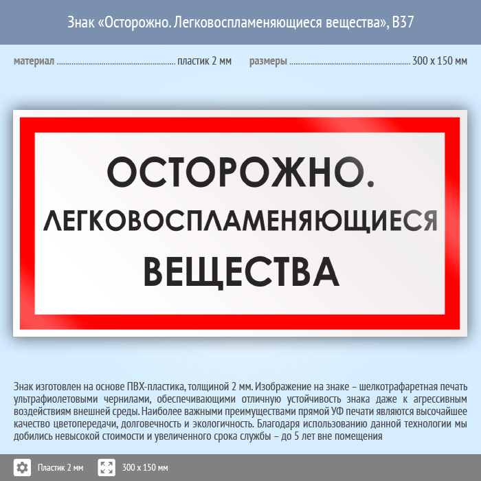 Знак «Осторожно. Легковоспламеняющиеся вещества», B37 (пластик, 300х150 мм) в Магнитогорске купить