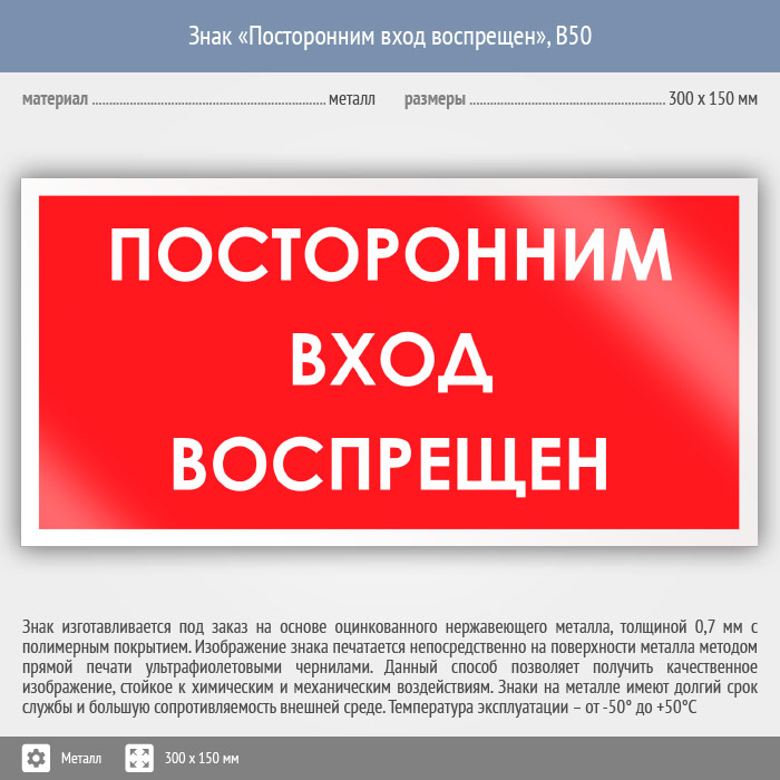 Знак «Посторонним вход воспрещен», B50 (металл, 300х150 мм) в Магнитогорске купить
