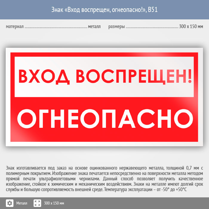 Знак «Вход воспрещен, огнеопасно!», B51 (металл, 300х150 мм) в Магнитогорске купить
