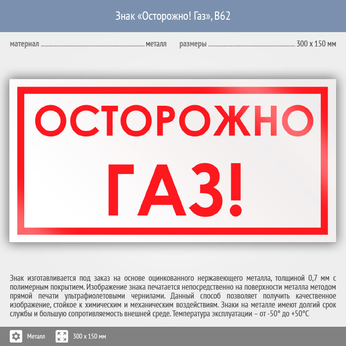 Знак «Осторожно! Газ», B62 (металл, 300х150 мм) в Магнитогорске купить