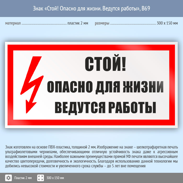 Знак «Стой! Опасно для жизни. Ведутся работы», B69 (пластик, 300х150 мм) в Магнитогорске купить