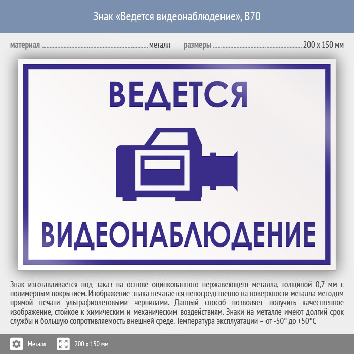 Знак «Ведется видеонаблюдение», B70 (металл, 200х150 мм) в Магнитогорске купить