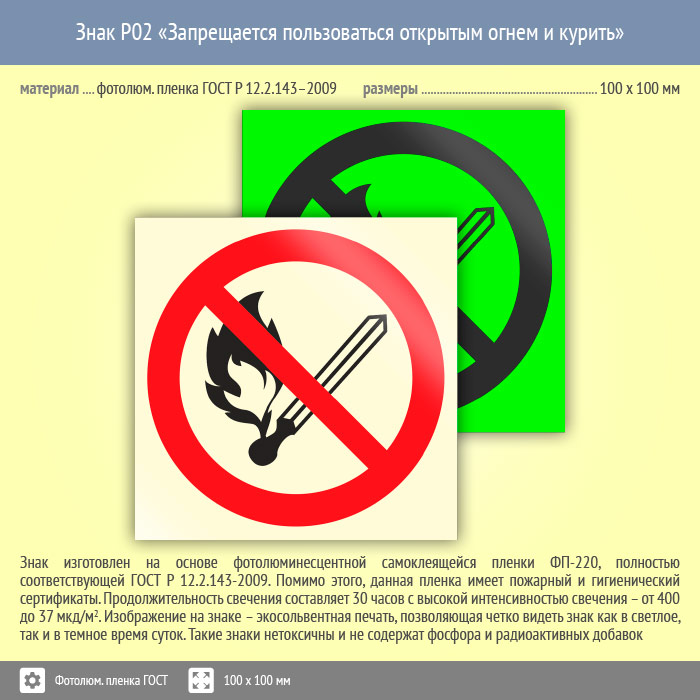 Знак P02 «Запрещается пользоваться открытым огнем и курить» (фотолюминесцентная пленка ГОСТ 34428-2018, 100х100 мм) в Магнитогорске купить