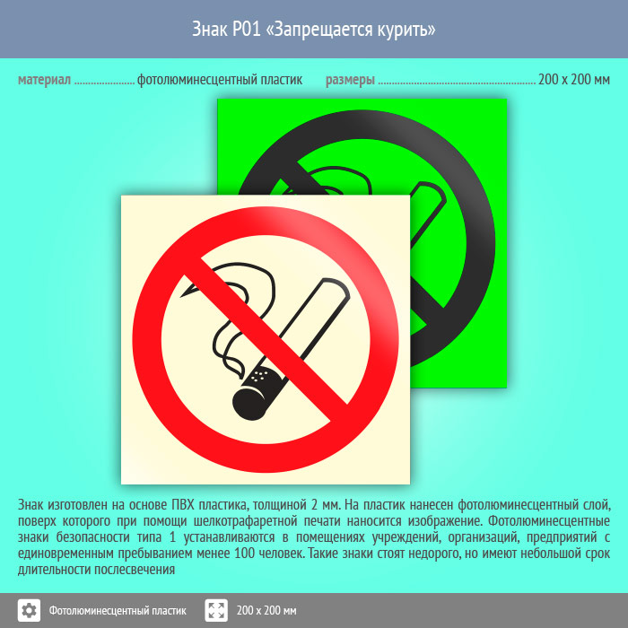 Знак P01 «Запрещается курить» (фотолюминесцентный пластик, 200х200 мм) в Магнитогорске купить