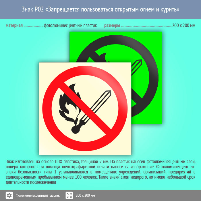 Знак P02 «Запрещается пользоваться открытым огнем и курить» (фотолюминесцентный пластик, 200х200 мм) в Магнитогорске купить