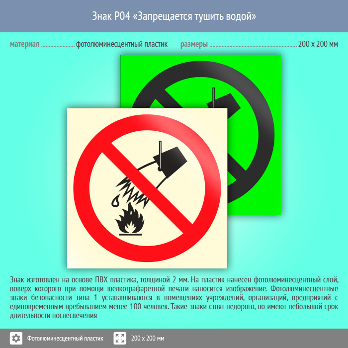 Знак P04 «Запрещается тушить водой» (фотолюминесцентный пластик, 200х200 мм) в Магнитогорске купить