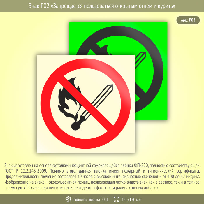 Знак P02 «Запрещается пользоваться открытым огнем и курить» (фотолюминесцентная пленка ГОСТ 34428-2018, 150х150 мм) в Магнитогорске купить