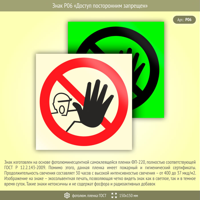 Знак P06 «Доступ посторонним запрещен» (фотолюминесцентная пленка ГОСТ 34428-2018, 150х150 мм) в Магнитогорске купить
