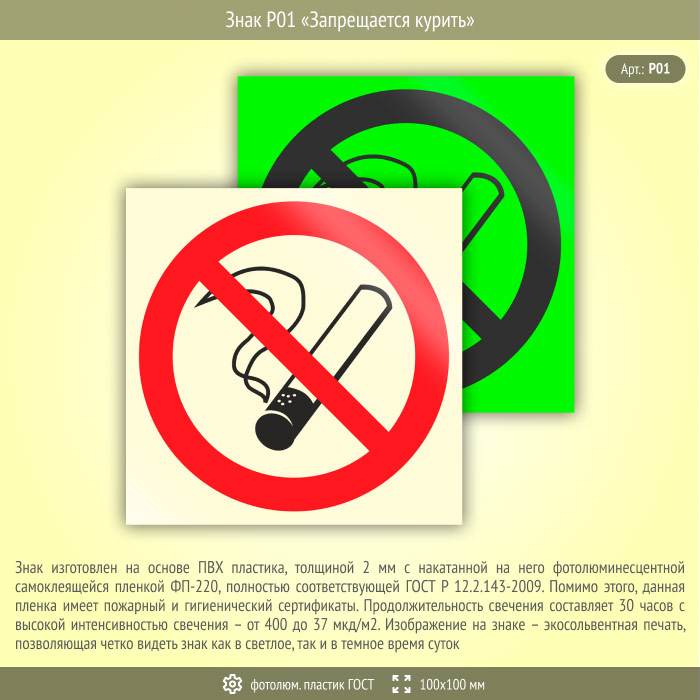Знак P01 «Запрещается курить» (фотолюминесцентный пластик ГОСТ 34428-2018, 100х100 мм) в Магнитогорске купить