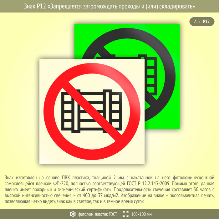 Знак P12 «Запрещается загромождать проходы и (или) складировать» (фотолюминесцентный пластик ГОСТ 34428-2018, 100х100 мм) в Магнитогорске купить