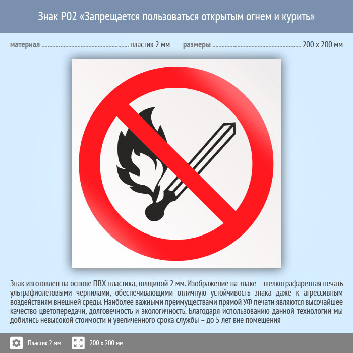 Знак P02 «Запрещается пользоваться открытым огнем и курить» (пластик, 200х200 мм) в Магнитогорске купить