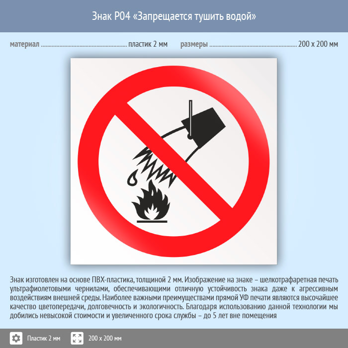 Знак P04 «Запрещается тушить водой» (пластик, 200х200 мм) в Магнитогорске купить