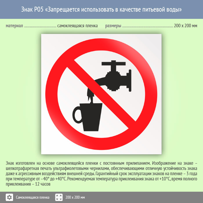 Знак P05 «Запрещается использовать в качестве питьевой воды» (пленка, 200х200 мм) в Магнитогорске купить