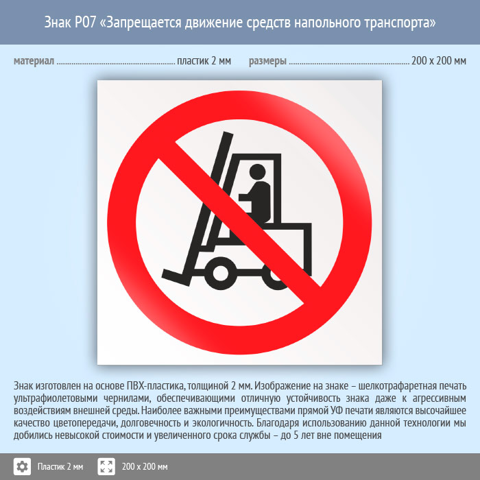 Знак P07 «Запрещается движение средств напольного транспорта» (пластик, 200х200 мм) в Магнитогорске купить