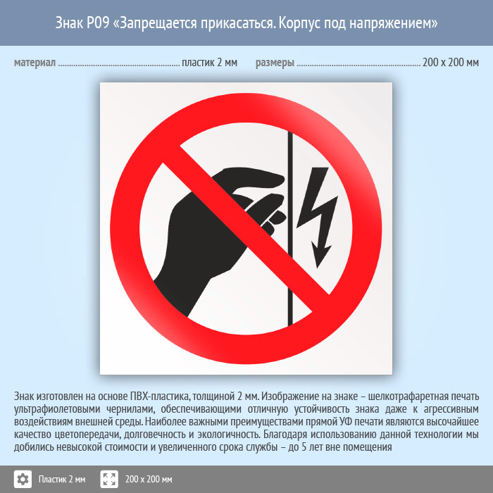 Знак P09 «Запрещается прикасаться. Корпус под напряжением» (пластик, 200х200 мм) в Магнитогорске купить