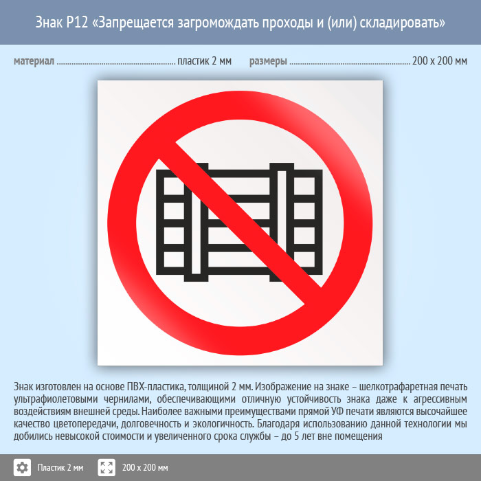 Знак P12 «Запрещается загромождать проходы и (или) складировать» (пластик, 200х200 мм) в Магнитогорске купить