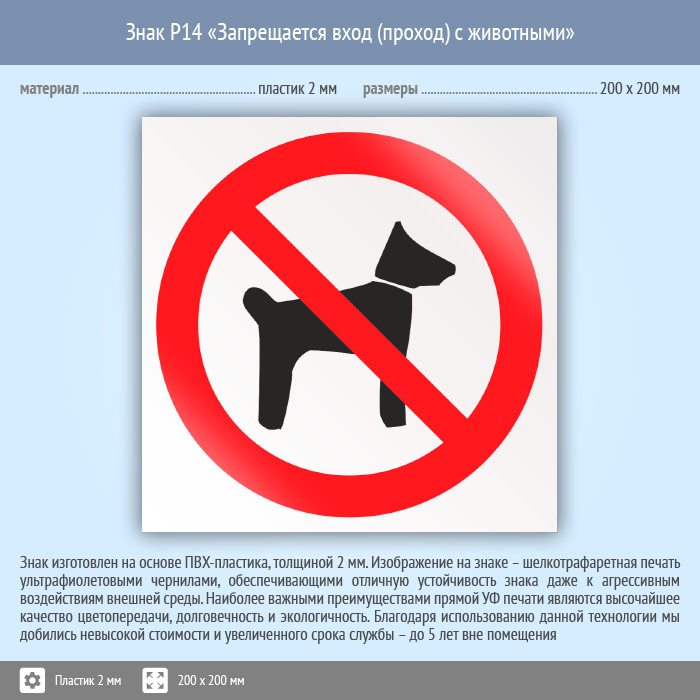 Знак P14 «Запрещается вход (проход) с животными» (пластик, 200х200 мм) в Магнитогорске купить
