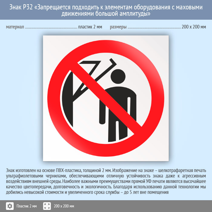 Знак P32 «Запрещается подходить к элементам оборудования с маховыми движениями большой амплитуды» (пластик, 200х200 мм) в Магнитогорске купить