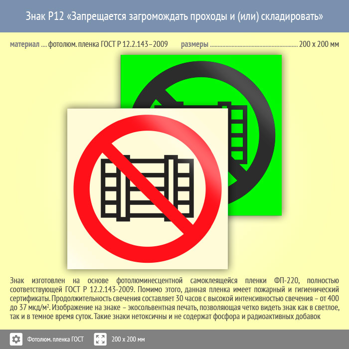 Знак P12 «Запрещается загромождать проходы и (или) складировать» (фотолюминесцентная пленка ГОСТ 34428-2018, 200х200 мм) в Магнитогорске купить