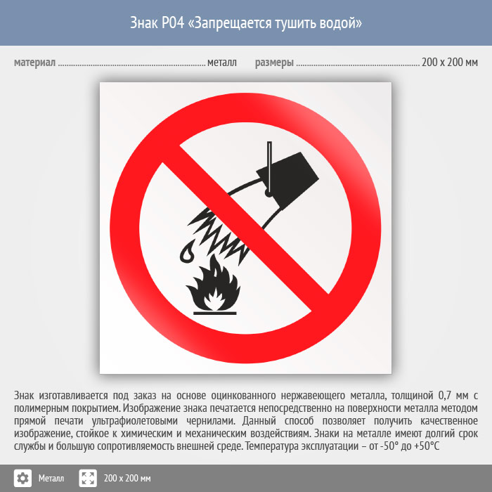 Знак P04 «Запрещается тушить водой» (металл, 200х200 мм) в Магнитогорске купить